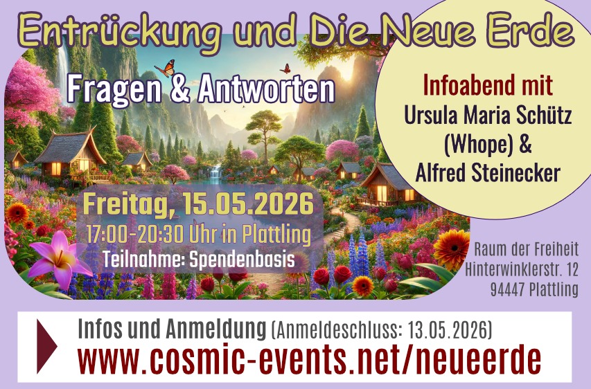 Aufgrund aktueller Informationen der jenseitigen Welt zu den kommenden Ereignissen für die Menschheit und deren Aufstieg auf die neue Erde soll diese kostenfreie Veranstaltung interessierte Menschen dabei unterstützen, sich auf diese Zeit großer Veränderungen vorzubereiten und Antworten auf die vielen Fragen geben, die damit verbunden sind.